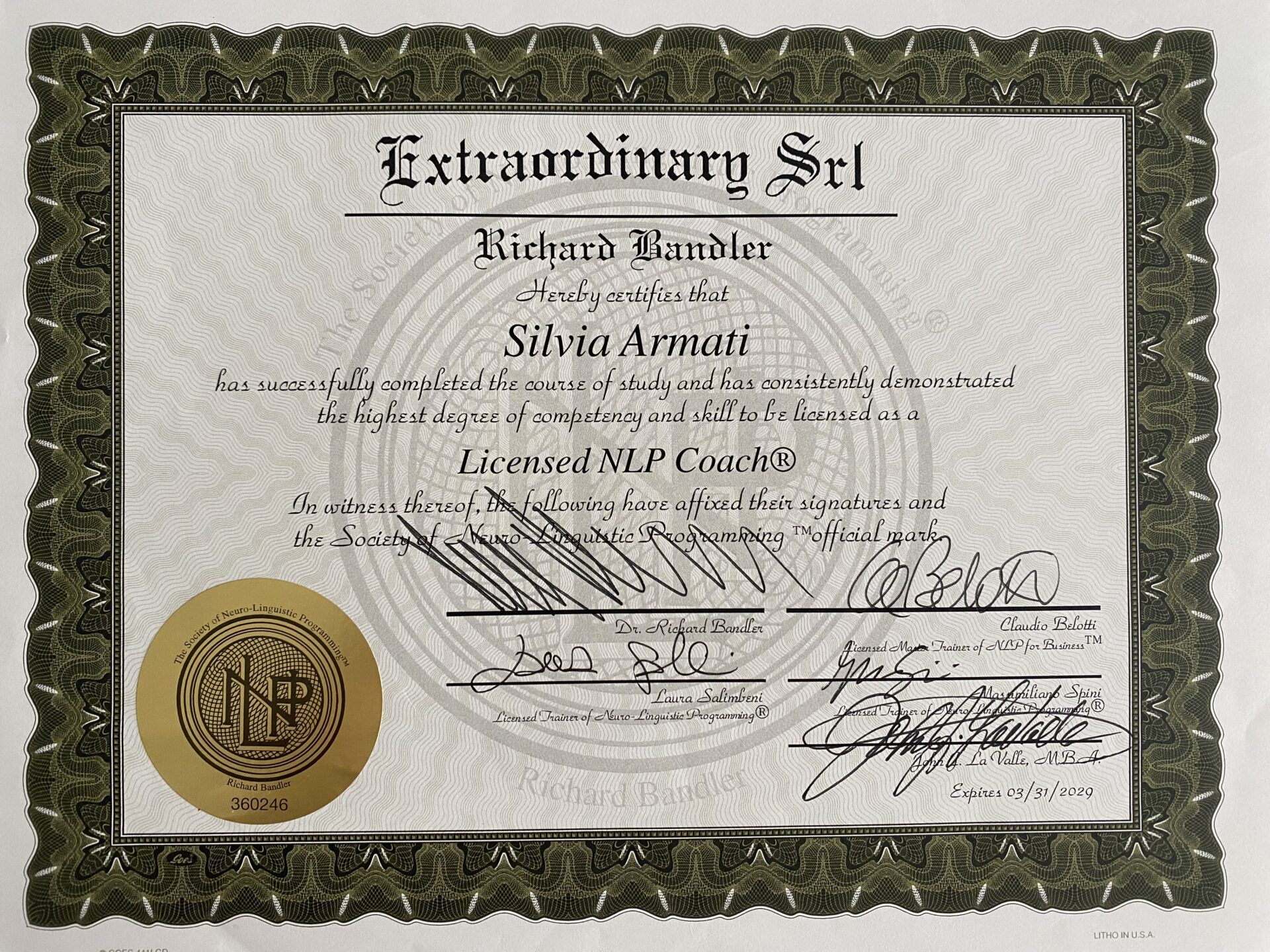 Eseguita presso la scuola di eccellenza Extraordinary Coaching School di Claudio Belotti Executive Coach, NLP & Tony Robbins Master Trainer e Senior Practitioner, grazie a questa certificazione, ho approfondito le mie competenze come NLP Coach, passando a un livello superiore rispetto a quanto appreso nelle precedenti certificazioni Practitioner e Master. Questo mi ha fornito uno scenario più ampio e competente per individuare in modo approfondito le sfide legate al mindset personale e professionale, migliorando la qualità della vita quotidiana. Tematiche trattate:
